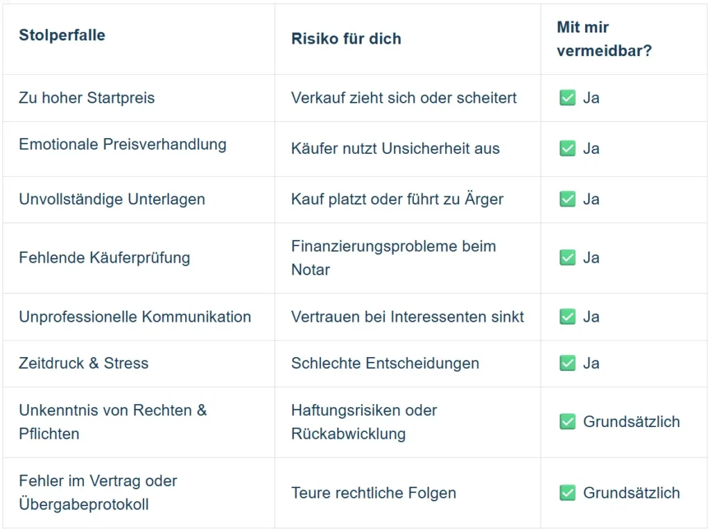 Auch wenn am Ende ein Notar den Vertrag aufsetzt – ohne fachliche Vorbereitung entstehen hier leicht Missverständnisse, Verzögerungen oder rechtliche Risiken. Nicht selten platzt der Verkauf beim Notartermin.